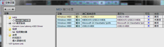在"设备设置"中必须保证MIDI线的IN/OUT都是激活状态!